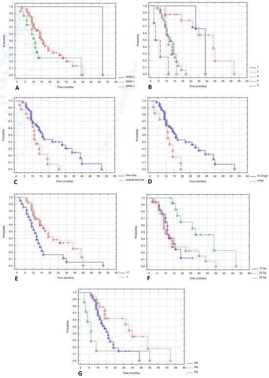 Figure 5 shows a statistically significant correlation between OS and WHO performance status (Figure 5A), line of systemic treatment (Figure 5B), extrahepatic and lung metastases (Figure 5C,D), number of metastases (Figure 5E), total dose (Figure 5F) and response to treatment (Figure 5G).