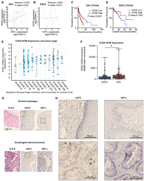 NT5E and HIF1α co-expressed in esophageal adenocarcinoma and negatively correlated with patient survival. (A,B) X/Y plot and correlation analysis between NT5E and HIF1α expression data across esophageal adenocarcinoma (EAC) cell lines (A) and esophageal squamous cell carcinoma (ESCC) lines (B) from DepMap. (C,D) Kaplan–Meier plots of EAC (C) and ESCC (D) patients stratified by NT5E expression; assessed using log-rank (Mantel–Cox) test. (E) NT5E expression across stages of esophageal cancer. (F) NT5E expression comparison between EAC and ESCC patients; significance determined by unpaired two-tailed t-test; * p-value < 0.05. (G) IHC of H&E stain (left), IHC of CD73 (middle) and IHC of HIF1 (right), in EAC tumor tissue (bottom) and adjacent normal tissue (top). (H) Higher-magnification view (8× enlargement) of the region indicated in Figure 1G.