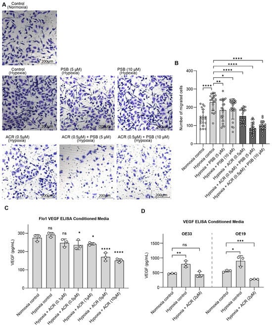 Dual inhibition of HIF1α and NT5E disrupts extracellular pathways associated with immune evasion and metastasis. (A,B) Representative images (A) and cell counts (B) in FLO-1 for the cell migration assay under hypoxia with indicated treatments; data represent mean ± SD of cell counts for n = 20 images across 2 separate experiments, analyzed by one-way ANOVA. (C,D) VEGF levels in conditioned media under hypoxia with indicated treatments, data represent mean ± SD (n = 3) analyzed by one-way ANOVA. ns = not significant; * p < 0.05; ** p < 0.01; *** p < 0.001; **** p < 0.0001.