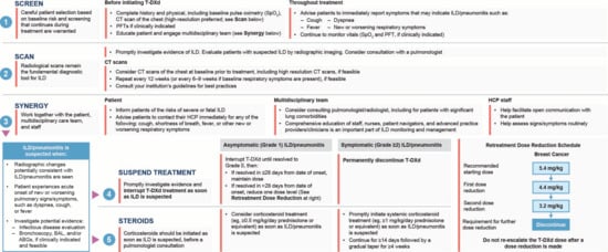 - Tarantino, P.; Tolaney, S.M. Detecting and managing T-DXd-related interstitial lung disease: The five “S” rules. JCO Oncol. Pract. 2023, 19, 526–527. [Google Scholar] [CrossRef]