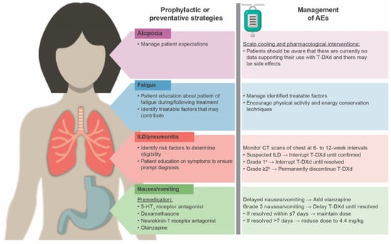 Monitoring and management of T-DXd–related AEs [5,119,121,124,132]. 5-HT3, serotonin receptor; AE, adverse event; CT, computed tomography; ILD, interstitial lung disease; T-DXd, trastuzumab deruxtecan. a Asymptomatic, radiographic findings only. b Grade 2: Symptomatic, mild respiratory symptoms that do not interfere with daily living. Grade 3: Symptomatic, interfering with daily living, possibly needing oxygen therapy. Grade 4: Severe, disabling symptoms leading to hospitalization and ventilatory support. Grade 5: Death.