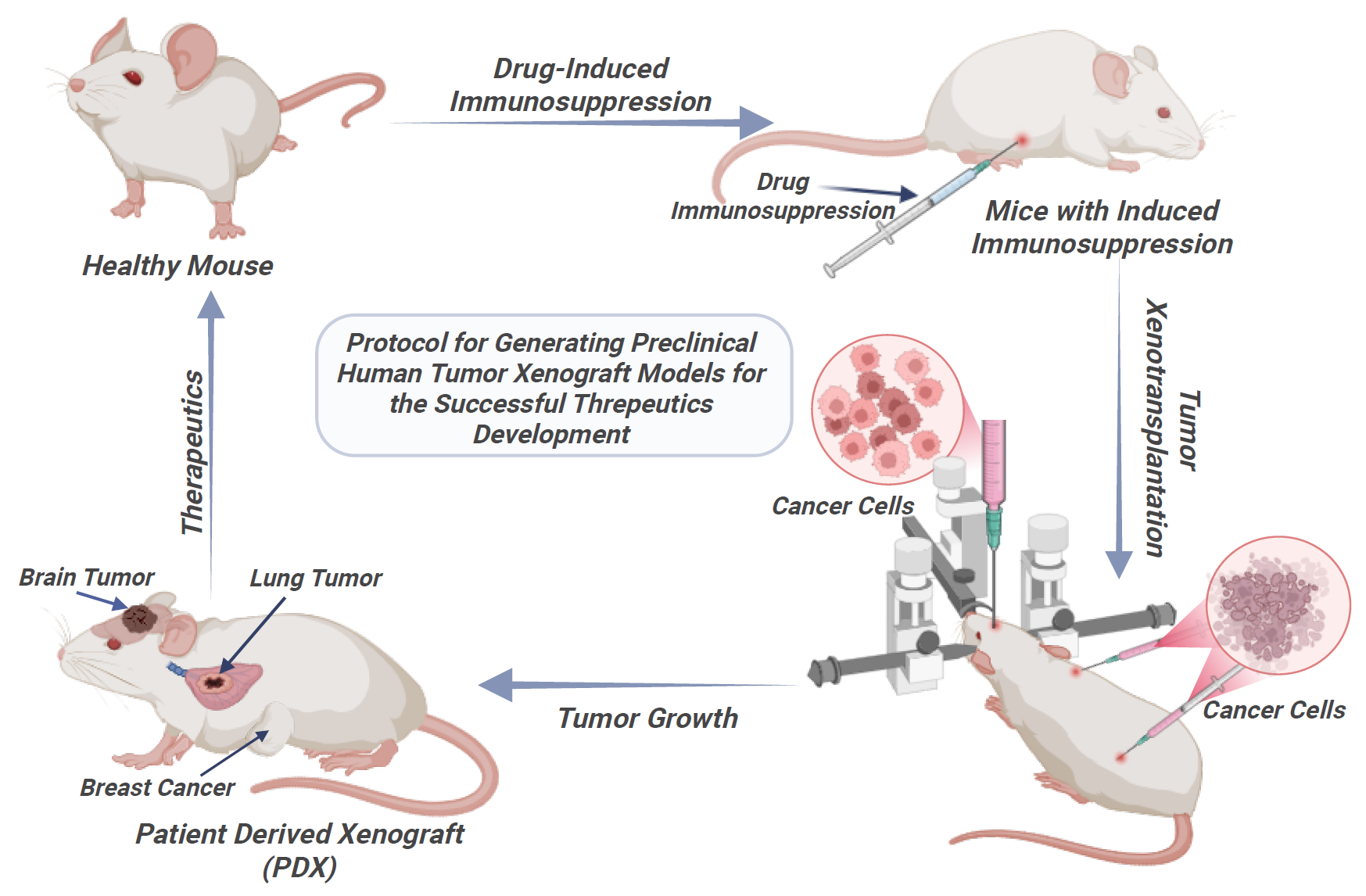 Despite its strengths, certain limitations of this approach must be acknowledged. The transient nature of the immunosuppression may not be suitable for studies re-quiring very long-term tumor observation. Furthermore, while we characterized systemic immune populations, the specific composition and role of intratumoral immune cells in these models remain to be fully elucidated. The potential systemic toxicity of the drug regimen, though manageable in our study, requires careful monitoring.