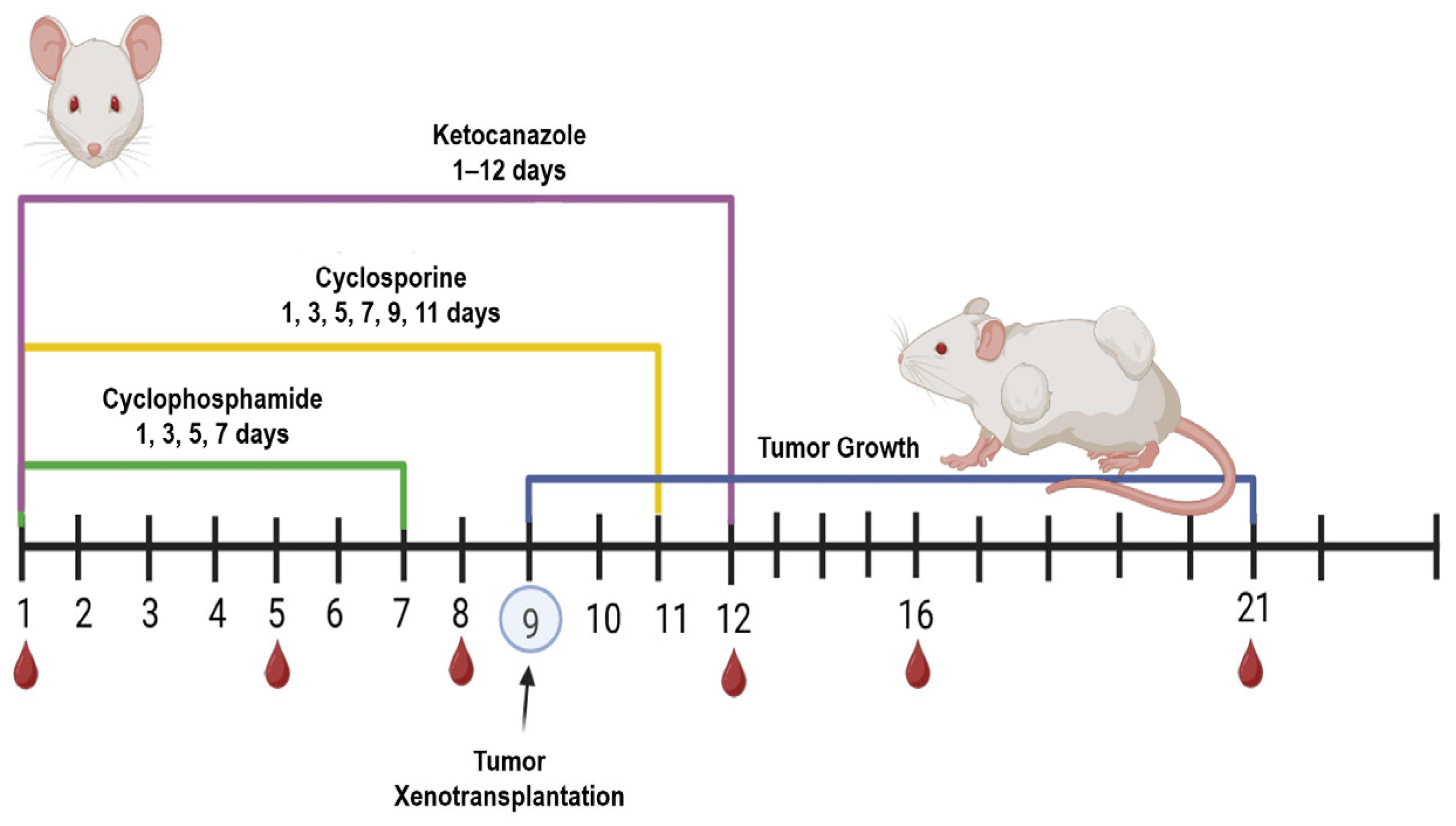 A combined immunosuppressive regimen using three drugs was applied to suppress the immune response in the mice: (1) cyclosporine (Catalent, Eberbach, Germany) at 20 mg/kg intraperitoneally every 48 h for 12 days; (2) cyclophosphamide (Baxter Oncology, Halle (Westfalen), GmbH, Germany) at 60 mg/kg intraperitoneally every 48 h for 8 days (administration was discontinued after four injections due to its cytotoxicity to all actively dividing cells and because tumor xenotransplantation was scheduled for day 10); (3) ketoconazole (ZiO-Health, Russia) at 10 mg/kg orally, provided ad libitum in drinking water for the entire 12-day immunosuppression period (