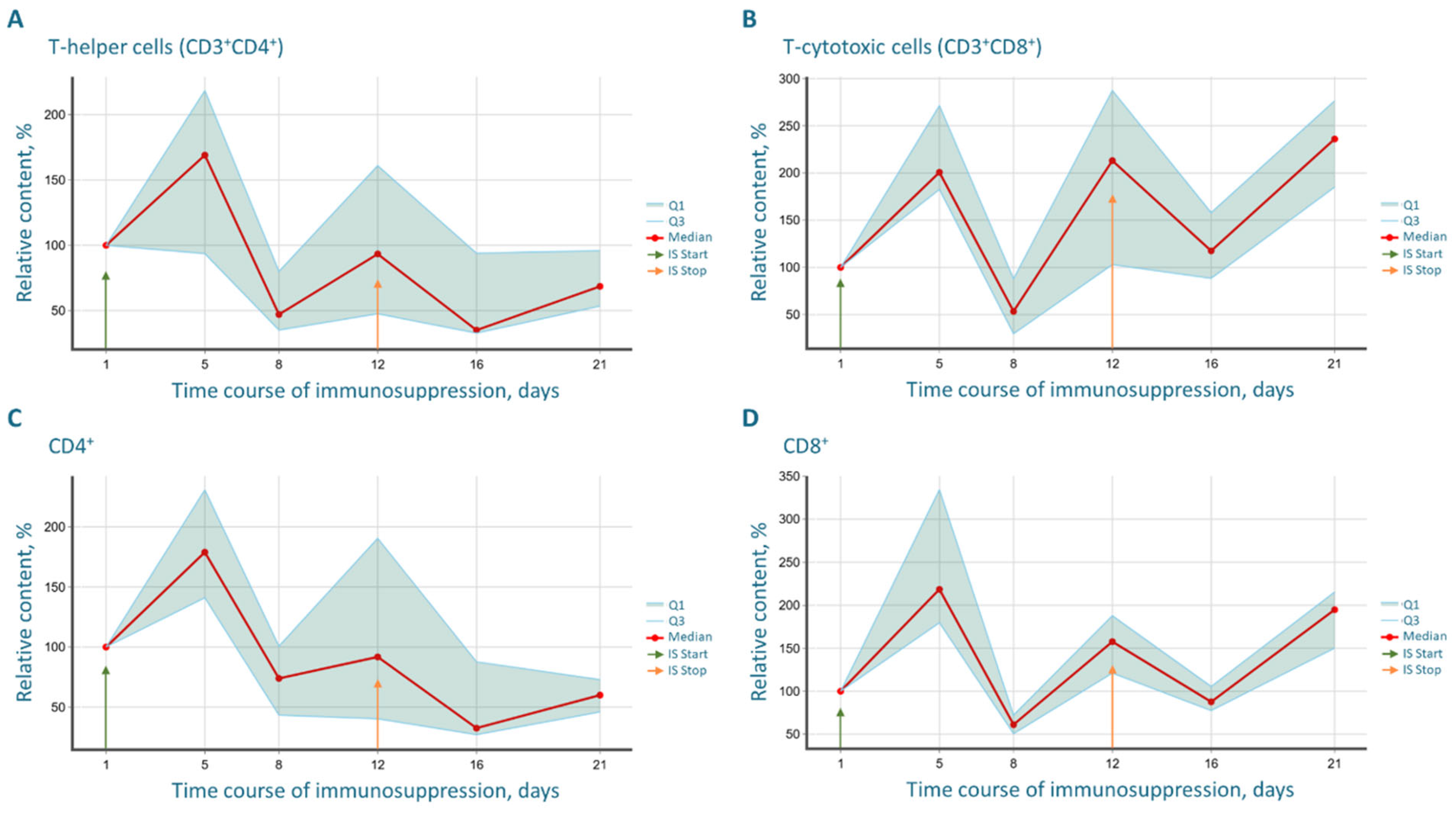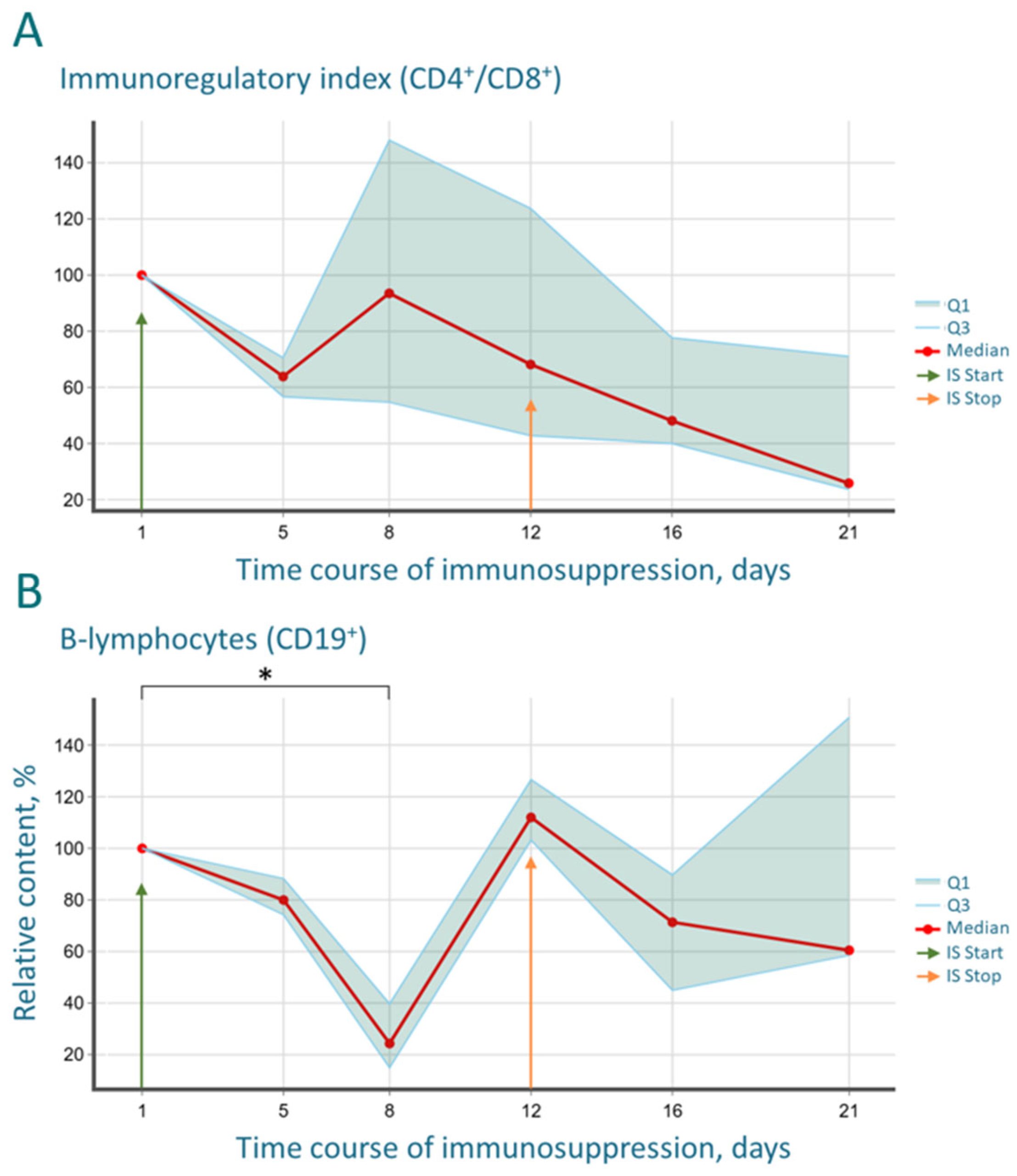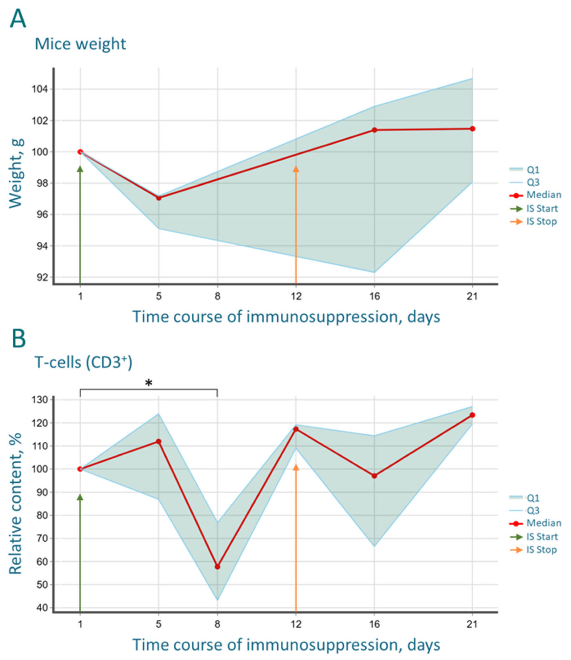 18]. However, a standardized protocol for achieving a defined state of partial immunosuppression is lacking, and comprehensive data on the dynamic changes in immune cell subpopulations following such interventions remain limited. In this context, we developed and characterized a combined pharmacological protocol for transient immunosuppression based on cyclosporine, cyclophosphamide, and ketoconazole, modifying an approach previously proposed by Jivrajani M. et al. [