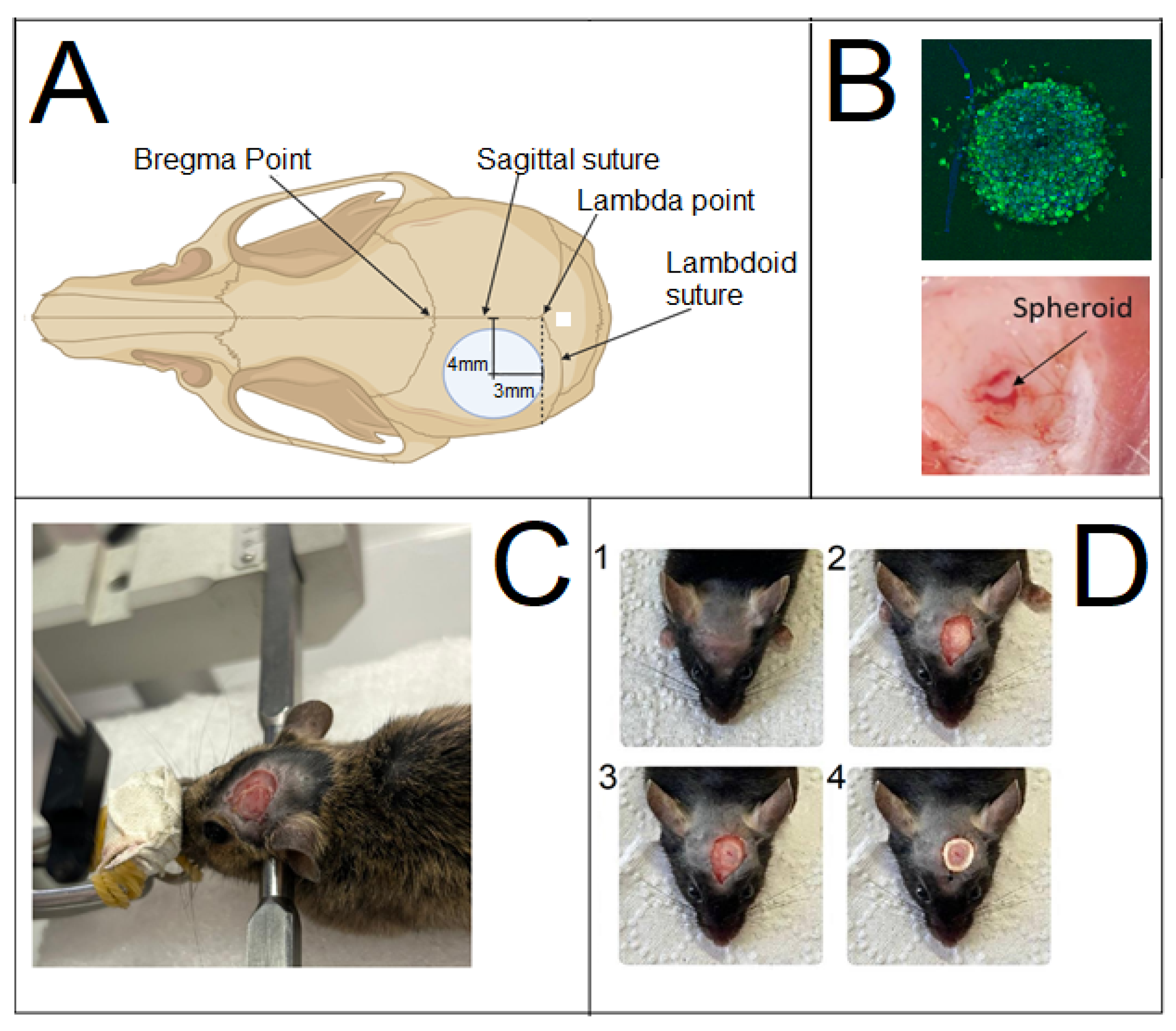 The procedure was identical to that used for transplantation through a cranial window, with the following modifications: a micro-perforation was created using either a 1 mm electric trephine or by manually rotating a syringe needle. A single 0.5 mm spheroid together with 2.5 × 105 dissociated tumor/stromal cells in 10 µL of a 1:1 GrowDex/DMEM hydrogel medium were loaded into a Hamilton syringe. This cell suspension was flanked by two 2 µL plugs of a denser 2:1 GrowDex/DMEM hydrogel. The tumor cells were then inoculated into the mouse brain through this perforation, after which the skin incision was sutured.