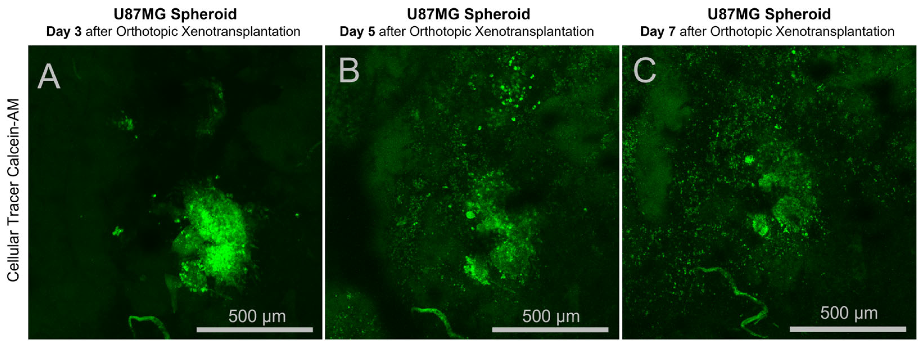 2 in a humidified incubator. Spheroid formation was monitored daily using an inverted phase-contrast microscope or a stereomicroscope; U87MG cells typically formed compact, rounded aggregates within 24–48 h. On the day of transplantation, spheroids were stained with the vital dye Calcein-AM (Sigma-Aldrich, St. Louis, MO, USA) at a working concentration of 1 µM in the culture medium for 1 h.