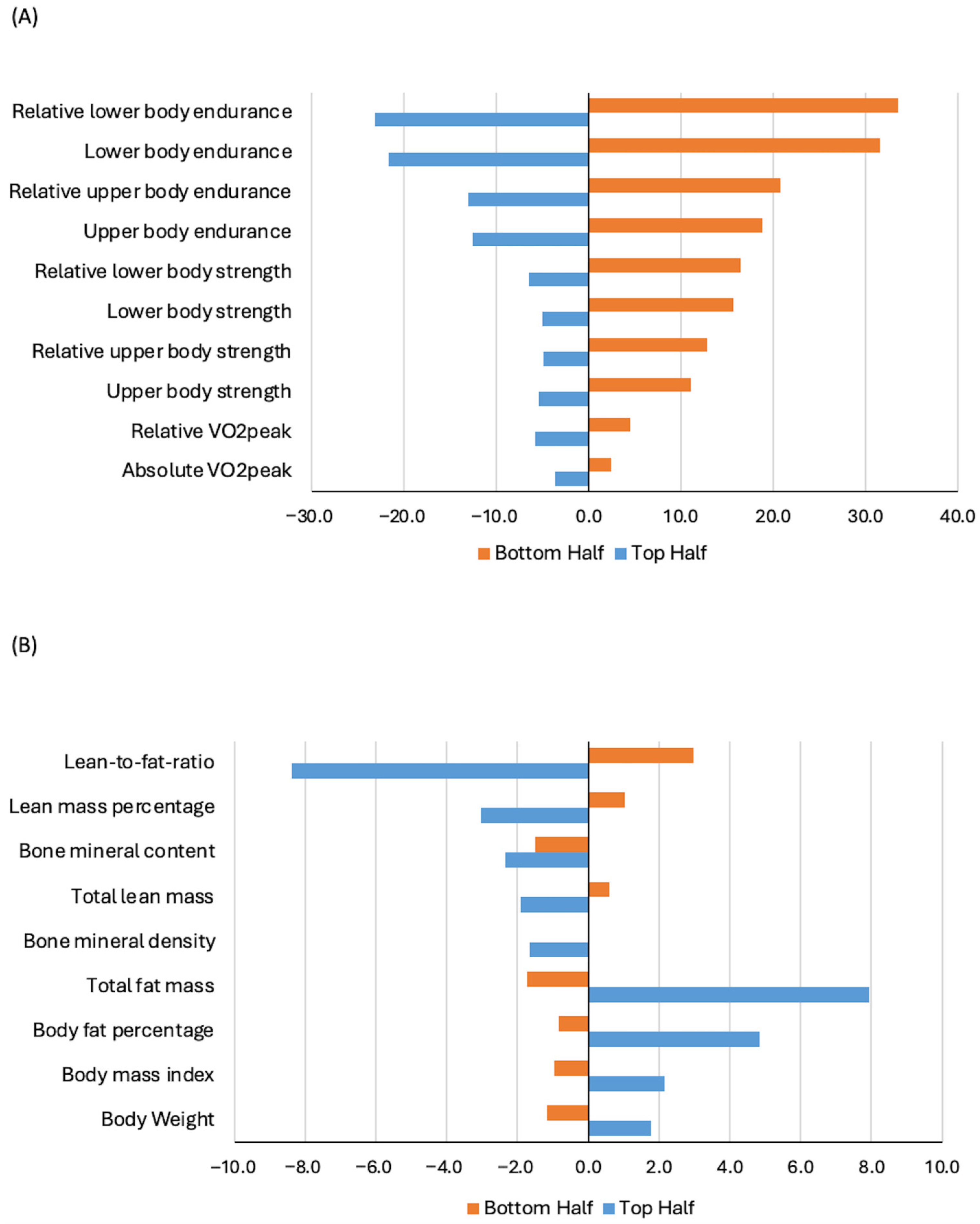 | Top half vs. Bottom half baseline fitness values | ↓ Absolute VO2peak ↓ Relative VO2peak | ↓ Upper body strength (absolute and relative) ↓ Lower body strength (absolute and relative) | ↓ Upper body endurance (absolute and relative) ↓ Lower body endurance (absolute and relative) | ↑ Body weight ↑ Body mass index ↓ Total lean mass and lean mass percentage ↑ Total fat mass and body fat percentage ↑ Lean-to-fat ratio ↓ Bone mineral density ↓ Bone mineral content |