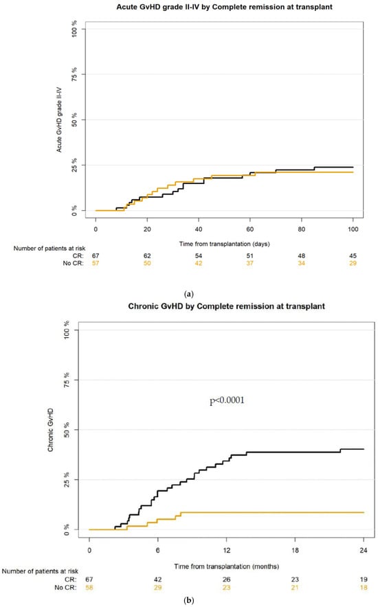(a) Cumulative incidence of aGvHD grade II-IV after haplo-HCT with PT-Cy in CR vs. no-CR group; (b) cumulative incidence of cGvHD after haplo-HCT with PT-Cy in CR vs. no-CR group.