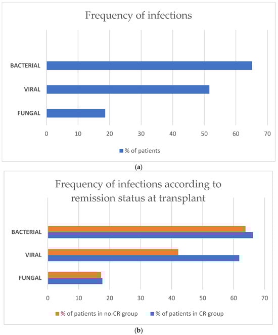 (a) Frequency of infectious complications after haplo-HCT with PT-Cy in the whole population. (b) Frequency of infectious complications after haplo-HCT with PT-Cy according to remission status at transplant.