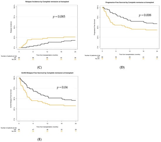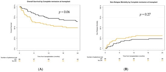 The median values and ranges were used for continuous variables and percentages for categorical variables. Patient-, disease-, and transplant-related variables were compared between the two groups (CR at transplant vs. no CR) using the Mann–Whitney U test for numerical variables, and the Chi-squared or Fisher’s exact test for categorical variables.
