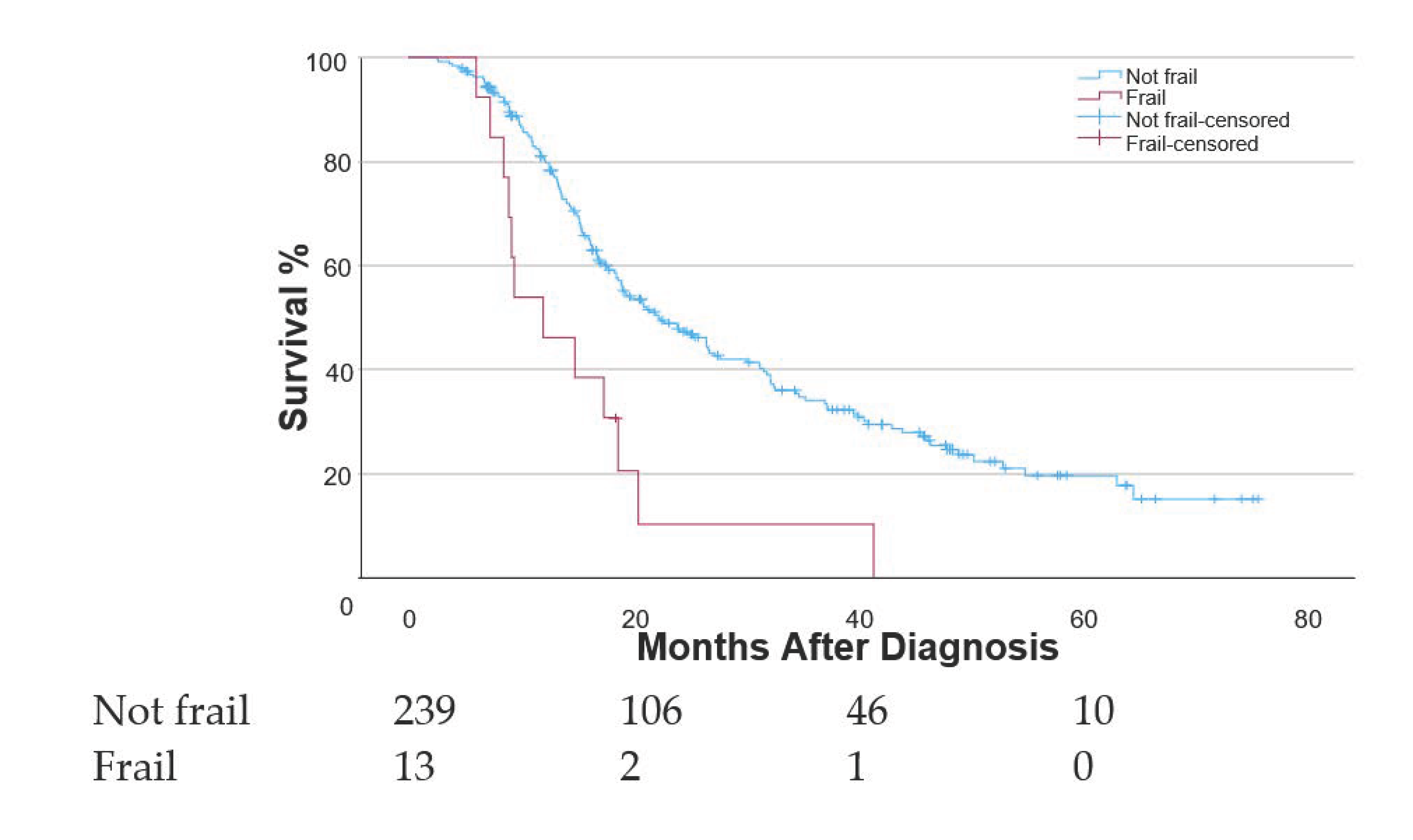 | Characteristic | Not Frail, n = 239 | Frail, n = 13 | p Value | Missing, n |
