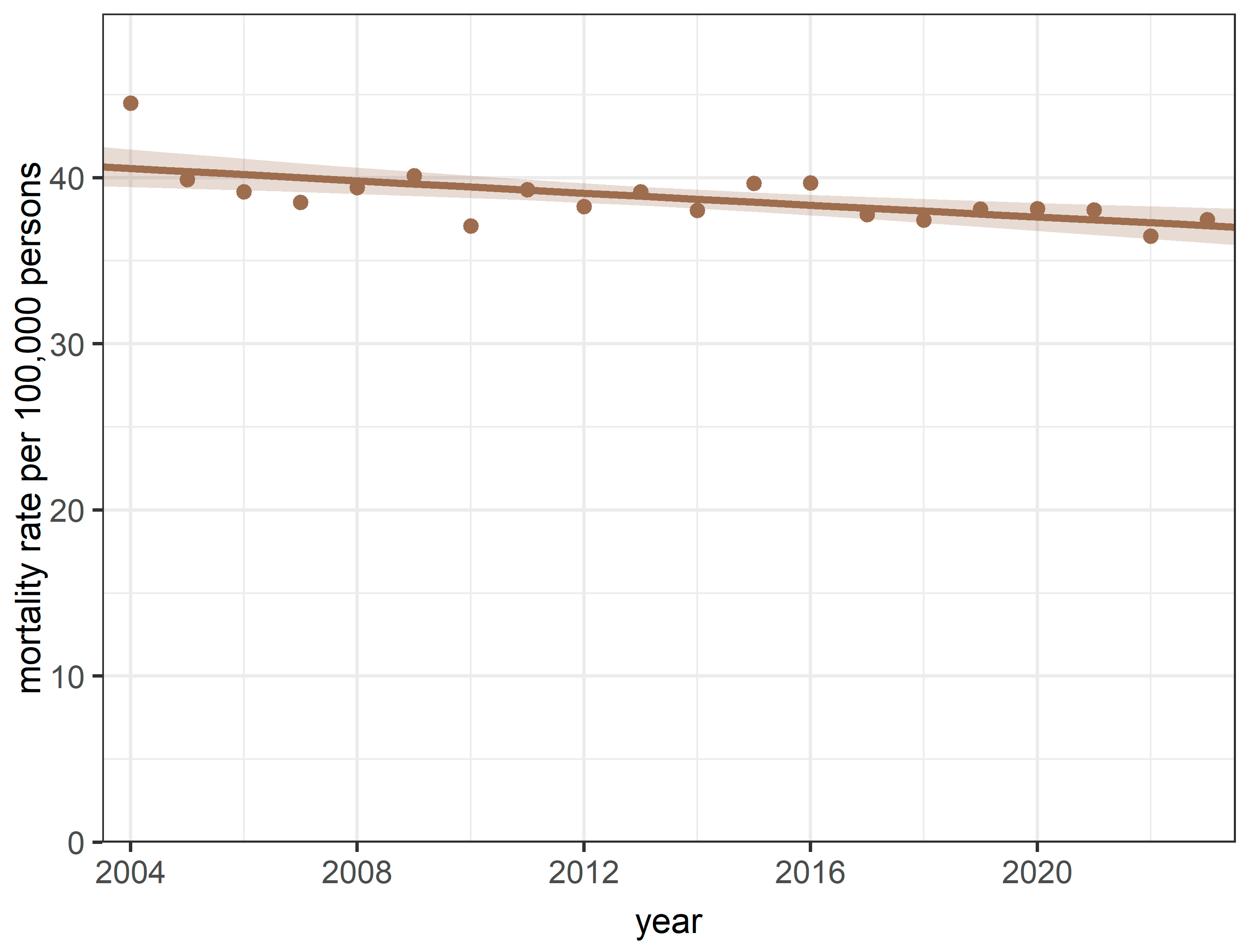 | Age (Years) | Number of Deaths from Breast Cancer (C50) | Age-Specific Rate | ASMR (Female Population Only) | All Female Deaths | Female Population |