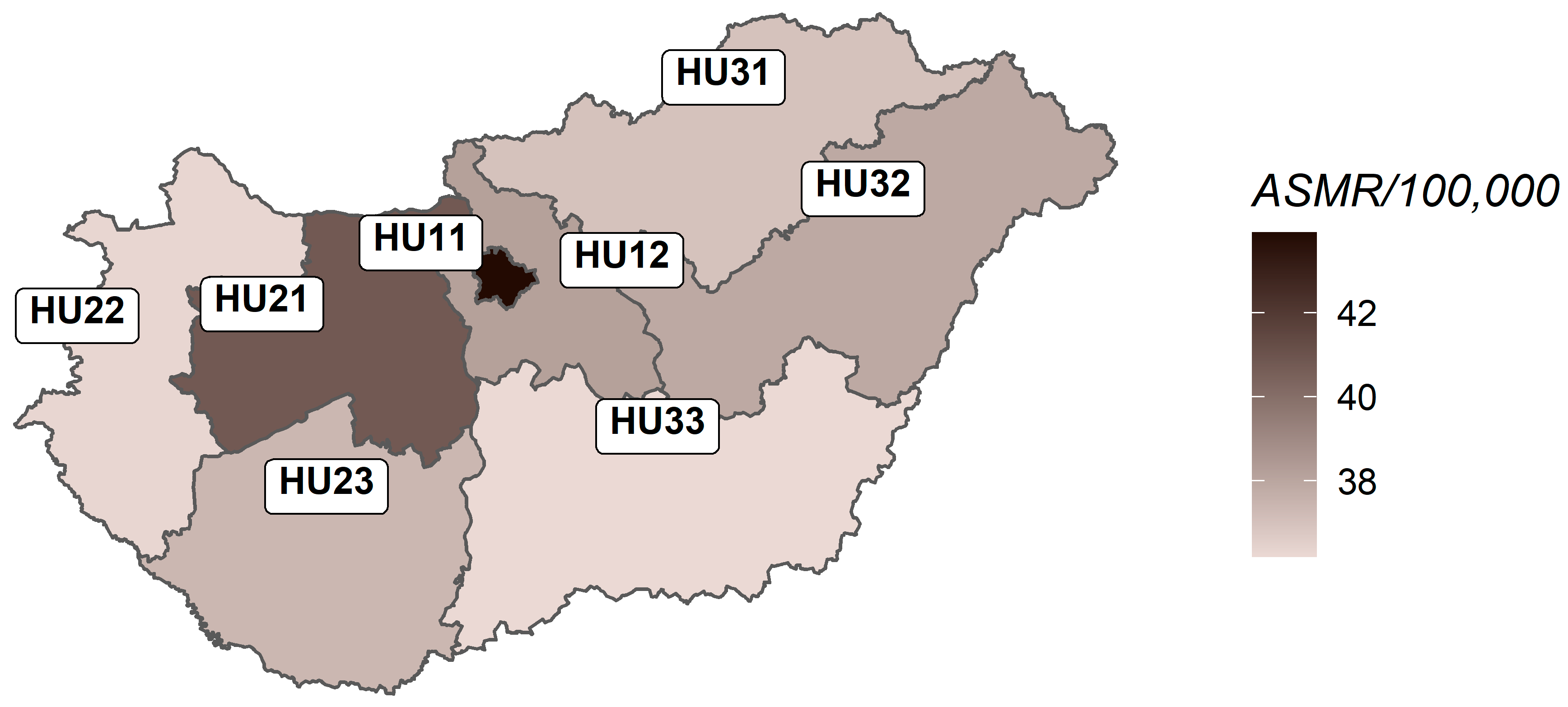 | Regions | Number of Deaths from Breast Cancer (C50) | ASMR (C50) | SD | Number of Female Deaths | Proportion of Deaths from Breast Cancer in Childless Women |