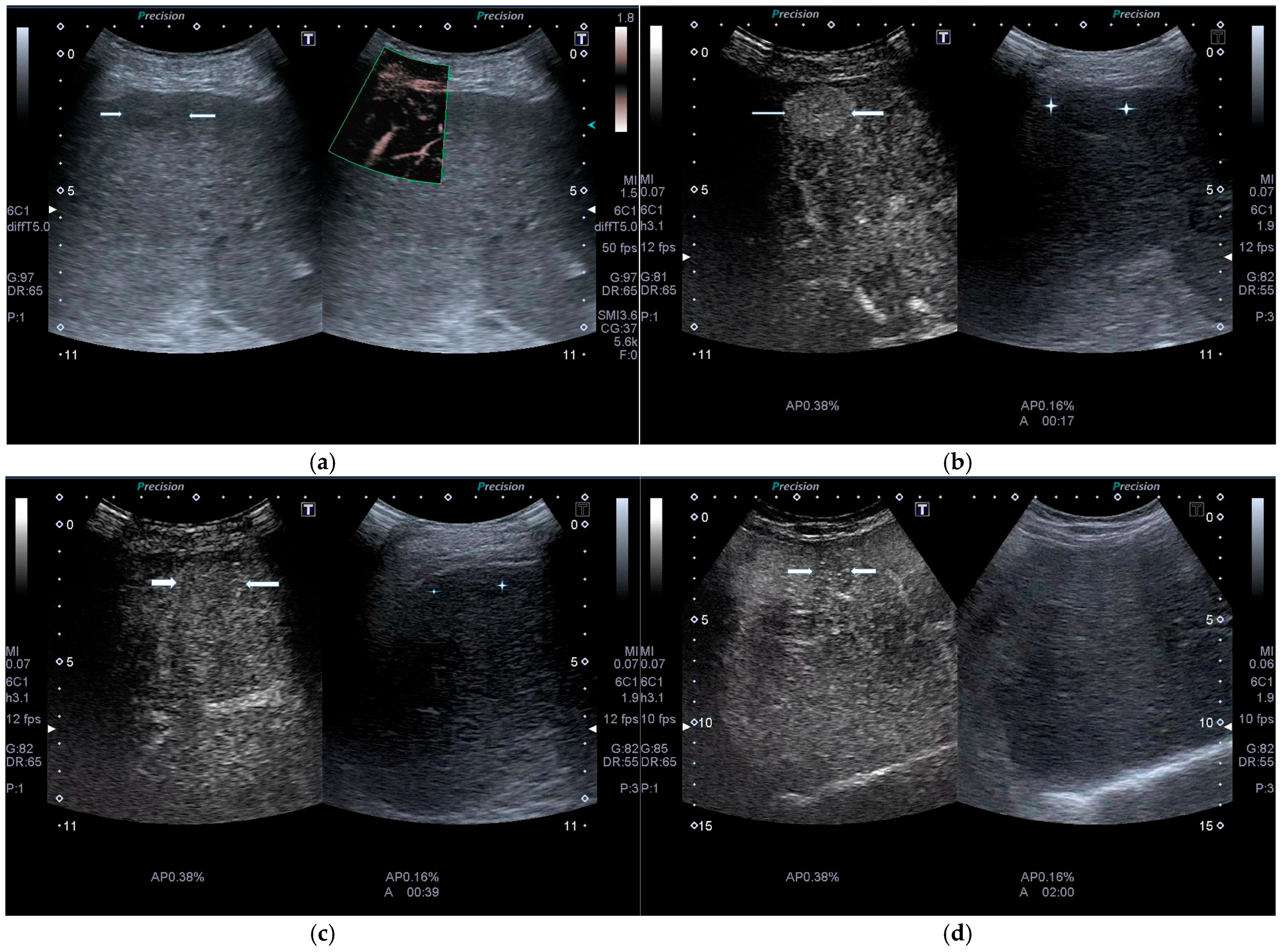 - Ferraioli, G.; Meloni, M.F. Contrast-enhanced ultrasonography of the liver using SonoVue. Ultrasonography 2018, 37, 25–35. [Google Scholar] [CrossRef] [PubMed]