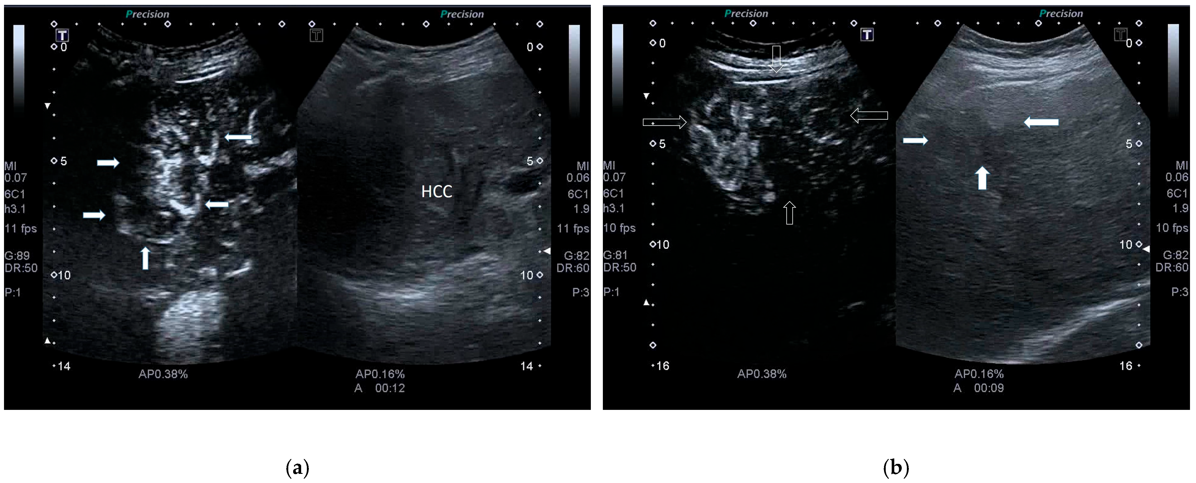 - Giorgio, A.; Ferraioli, G.; Tarantino, L.; de Stefano, G.; Scala, V.; Scarano, F.; Coppola, C.; Del Viscovo, L. Contrast-enhanced sonographic appearance of hepatocellular carcinoma in patients with cirrhosis: Comparison with contrast-enhanced helical CT appearance. AJR Am. J. Roentgenol. 2004, 183, 1319–1326. [Google Scholar] [CrossRef] [PubMed]