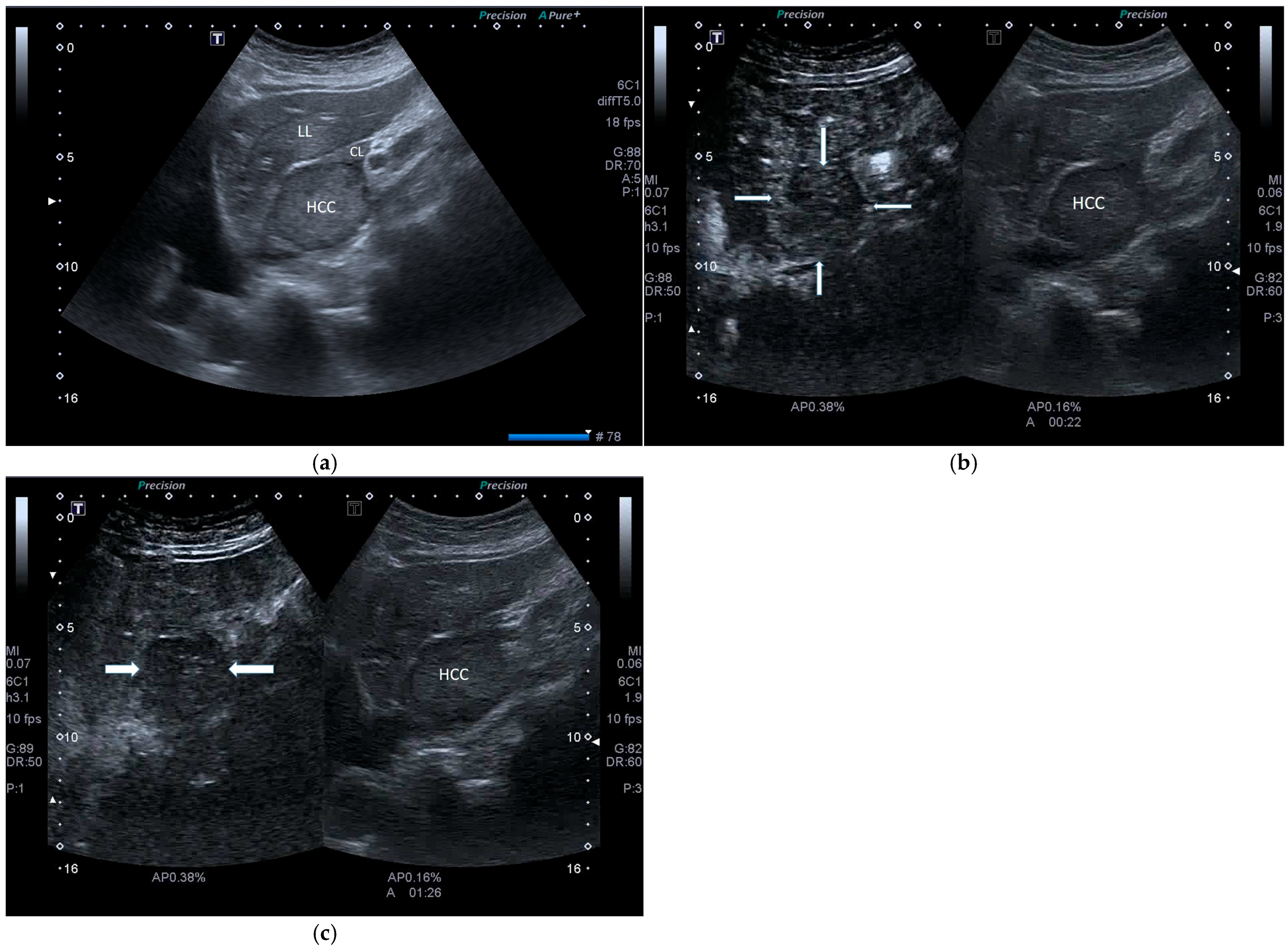 - Rodgers, S.K.; Fetzer, D.T.; Seow, J.H.; McGillen, K.; Burrowes, D.P.; Fung, C.; Udare, A.S.; Wilson, S.R.; Kamaya, A. Optimizing US for HCC surveillance. Abdom. Radiol. 2025, 50, 2453–2463. [Google Scholar] [CrossRef] [PubMed]