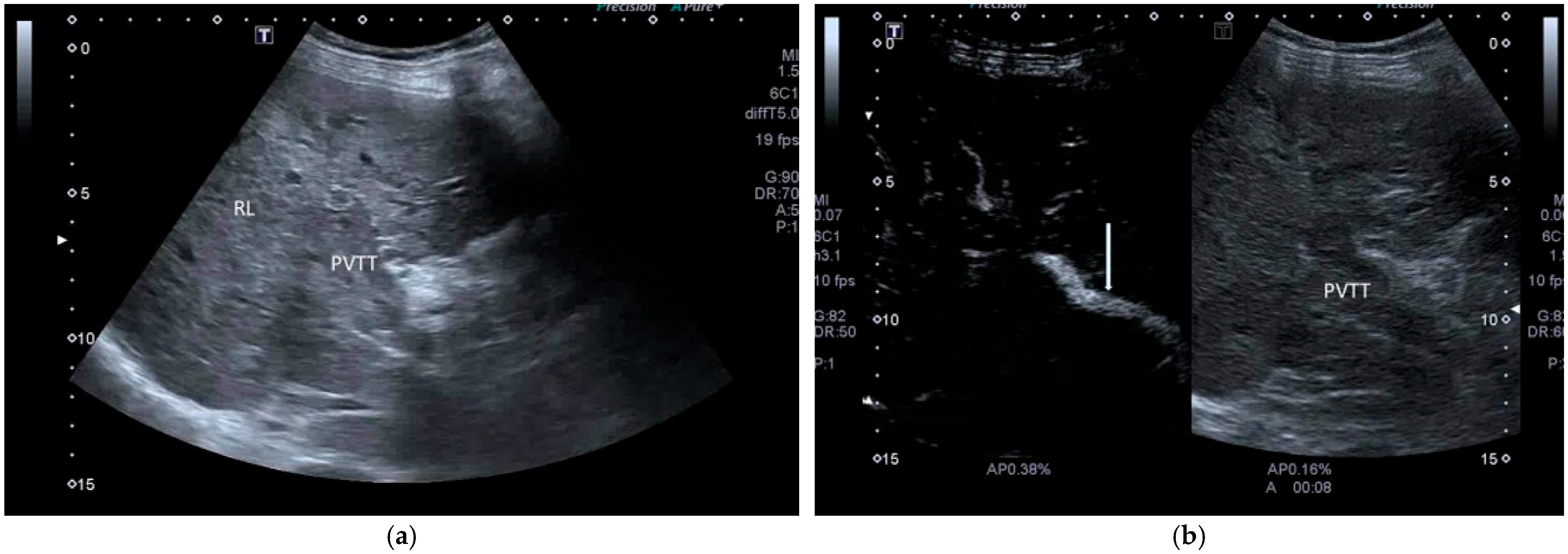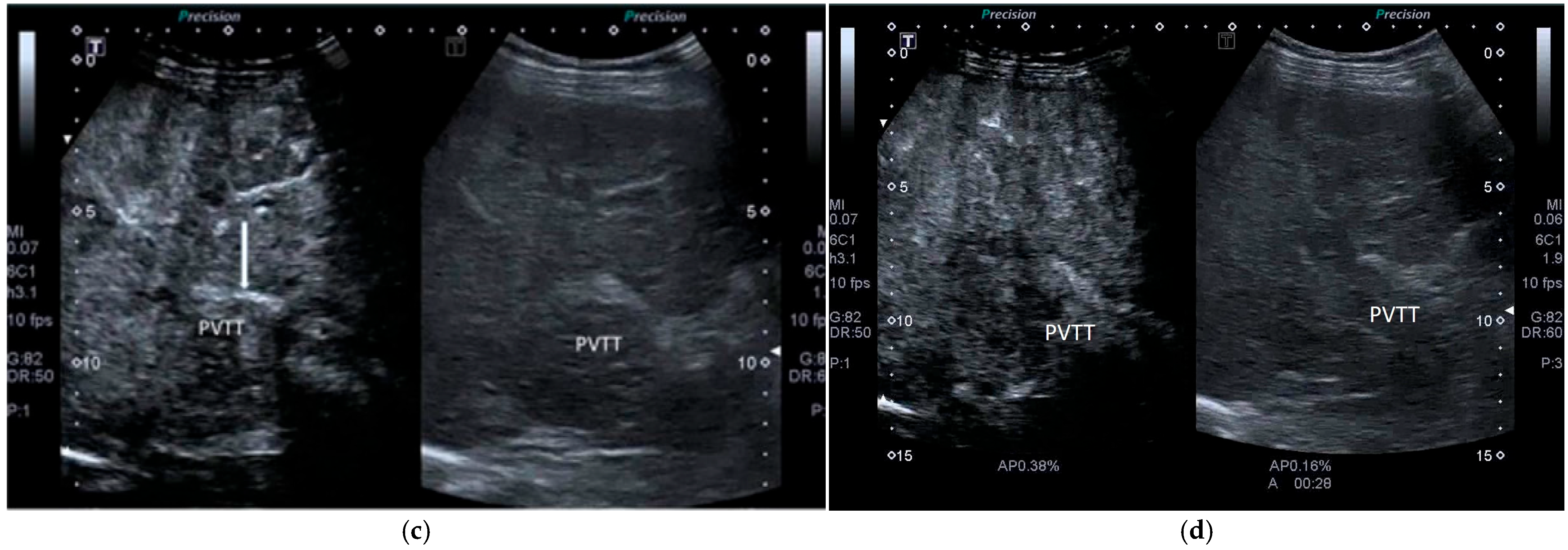 - Cerrito, L.; Ainora, M.E.; Di Francesco, S.; Galasso, L.; Gasbarrini, A.; Zocco, M.A. The Role of Contrast-Enhanced Ultrasound (CEUS) in the Detection of Neoplastic Portal Vein Thrombosis in Patients with Hepatocellular Carcinoma. Tomography 2023, 9, 1976–1986. [Google Scholar] [CrossRef] [PubMed]