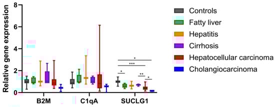 SUCLG1 mRNA levels decrease with liver-tissue deterioration alterations. Expression mRNA levels of B2M, C1qA, and SUCLG1 in tissues with normal appearance (n = 9) or tissue specimen with diagnosis: Fatty liver (n = 5), hepatitis (n = 3), cirrhosis (n = 5), hepatocellular carcinoma (n = 24) or cholangiocarcinoma (n = 3). Significant differences are indicated by asterisks: <0.05 (*), <0.01 (**), and <0.001 (***). All tissue samples in the liver cancer cohorts are biopsied from the tumor tissue area.