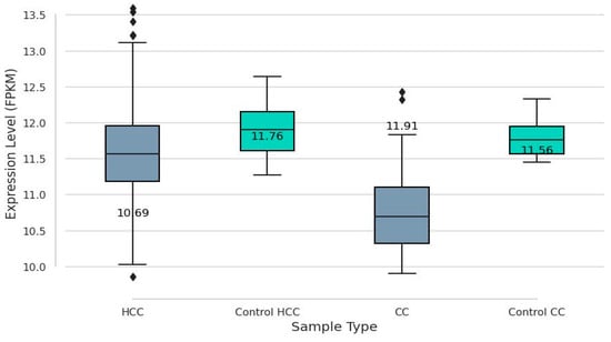 For the SUCLG1 gene, patients were divided into two groups (high expression and low expression) according to an identified optimal expression cut-point. This was achieved by exhaustively applying a log-rank test to multiple configurations of the two groups of patients. The optimal cut-point was defined as the SUCLG1 expression value that minimized the statistical significance of the log-rank test, thereby indicating the greatest separation in overall survival probability between the two groups. Kaplan–Meier survival curves were then generated using the KaplanMeierFitter function from the lifelines Python library v0.27.8 [23], which was then used to visualize the differences in survival probabilities over time. The statistical significance of survival differences between groups was assessed using the log-rank test, from which p-values and chi-square statistics were extracted. To compare the distributions of the HCC and CC groups for the gene SUCLG1, the Mann–Whitney U test was performed using the mannwhitneyu function of the Python library SciPy.