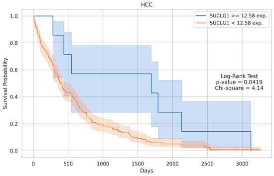 Kaplan–Meier survival curves for SUCLG1 expression in HCC. Kaplan–Meier survival plots display the survival probabilities for patients grouped by SUCLG1 expression levels in hepatocellular carcinoma (HCC). In HCC, high SUCLG1 expression (≥12.58) was associated with improved survival compared to low expression (<12.58) (log-rank test: p = 0.0419, χ2 = 4.14). The high-expression group comprised 24 samples, while the low-expression group included 330 samples.