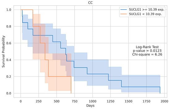 Kaplan–Meier survival curves for SUCLG1 expression in CC. Kaplan–Meier survival plots display the survival probabilities for patients grouped by SUCLG1 expression levels in cholangiocarcinoma (CC). In CC, patients with high SUCLG1 expression (≥10.39) had significantly better survival compared to those with low expression (<10.39) (log-rank test: p = 0.0123, χ2 = 6.26). The high-expression group included 23 samples, while the low-expression group consisted of 13 samples.
