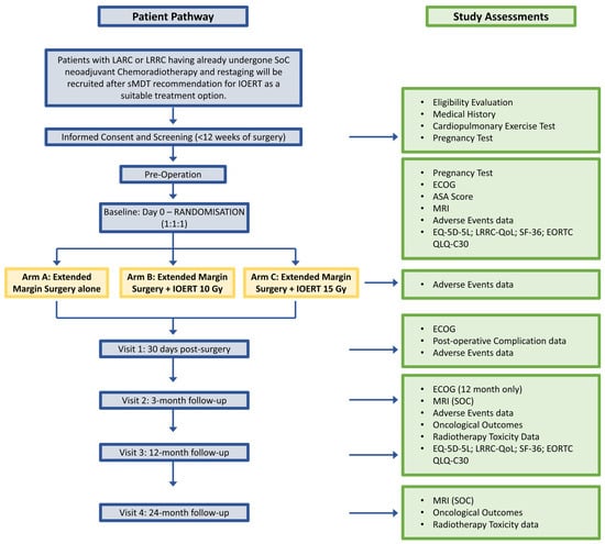 The process was designed so that during the procedure, the surgical team would conduct the exenterative procedure as intended and directed by the MDT-determined surgical roadmap. Subsequently, the IOERT team, composed of a clinical oncologist, a medical physicist, and radiographers, would be called to the theatre. At this point, the surgeon and clinical oncologist would assess the specimen, the tumour bed, and preoperative imaging to determine the utility of IOERT. If IOERT was deemed necessary, the applicator would be positioned, and the system set up. The theatre would then be vacated (with remote anaesthesia and monitoring operational as standard), and patients would be randomized at this stage via a web-based system (1:1:1 ratio) by the lead physicist, who would be the only individual to know the outcome of the randomization, i.e., whether IOERT would be administered and at what dose, or if no IOERT would be delivered. The surgeon, oncologist, and patient would remain blinded throughout the study, and randomisation would be stratified by LARC or LRRC, with the maintenance of blinding being an outcome measure of the study. Nonetheless, conditions for unblinding were planned in the event that any participant’s further treatment might benefit from additional radiotherapy, and if potential IOERT treatment and its dose might therefore impact this.