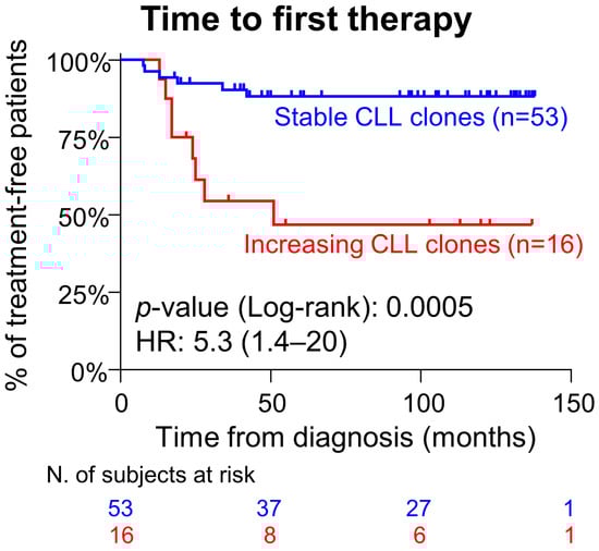 Once we compared CLL patients with increasing vs. stable B-cell clones, the former cases showed a significantly shorter TFT due to disease progression [hazard ratio (95%CI): 5.3 (1.4–20); p = 0.0005; Figure 1].