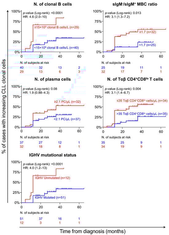 Since a follow-up period of at least 6–12 months was required to evaluate the kinetics of the CLL clone in individual patients, we further investigated whether there were biomarkers already measurable at diagnosis that may help identify CLL patients carrying increasing clones. Univariate analysis revealed that the presence of ≥15 × 109/L clonal B-cells in blood and their IGHV mutational status (UM), together with a greater (≥1.7) sIgM−/sIgM+ MBC ratio, higher PC counts (≥2.1 cells/µL), and lower Tαβ CD4+CD8lo cell numbers (≤35 cells/µL) in blood, were all associated with an increasing CLL clone profile (Figure 2). Multivariate analysis revealed that from these variables, only the presence of ≥15×109/L clonal B-cells, ≤35 Tαβ CD4+CD8lo cells/µL, and an unmutated IGHV gene status were independent variables to predict CLL with rapidly growing B-cell clones (Table 2). In line with these findings, a greater number of clonal B-cells (≥15 × 109/L) and total PC counts (≥3.3 cells/µL), the presence of del(17p) (TP53), and an unmutated IGHV gene status were all associated with a shorter TFT among CLL A/0 patients (Figure S2). Interestingly, the proportion of clonal B-cells carrying del17p (TP53) among the three cases found to have this alteration (all of them with stable CLL clones) was highly variable: 7%, 58%, and 98%, suggesting that its predictive value for TFT might be independent from the tumor cell kinetics. When considering disease progression (i.e., time to first treatment), only the absolute number of ≥15 × 109/L clonal B-cells and an unmutated IGHV status, along with ≥3.1 cells/µL PCs, were significantly associated with TFT in the univariate analysis, the number of clonal B-cells and an unmutated IGHV status retaining their significance in the multivariate and Cox regression analyses (Table S10).
