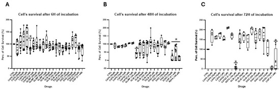 Percentage changes in cell survival in multi-wells crystal violet (CV) assay in DIPG-36 cells. (A) Capsaicin (CAPS) (10 μM to 50 μM), capsazepine (CAPSZ) (0.1 μM to 1 μM), glimepiride (GLIMP) (1 μM to 200 μM), glibenclamide (GLIB) (50 nM to 100 μM), tolbutamide (TOLB) (50 μM), diazoxide (DIAZO) (25 μM to 250 μM), doxorubicin (DOXO) (10 μM), and cisplatin (CISP) (0.1 mM) data after 6 h of incubation. REPA was not evaluated. (B) Capsaicin (CAPS) (1 μM to 50 μM), capsazepine (CAPSZ) (0.1 μM to 1 μM), repaglinide (REPA) (100 μM), glimepiride (GLIMP) (1 μM to 100 μM), glibenclamide (GLIB) (50 nM to 100 μM), tolbutamide (TOLB) (50 μM), diazoxide (DIAZO) (25 μM to 250 μM), doxorubicin (DOXO) (10 μM) and cisplatin (CISP) (0.1 mM) data after 48 h of incubation. (C) Capsaicin (CAPS) (1 μM to 50 μM), capsazepine (CAPSZ) (0.1 μM to 1 μM), repaglinide (REPA) (100 μM), glibenclamide (GLIB) (50 nM to 100 μM), diazoxide (DIAZO) (25 μM to 250 μM), doxorubicin (DOXO) (10 μM) and cisplatin (CISP) (0.1 mM) data after 72 h of incubation. The data are the means of at least three samples and six replicates. Data are significantly different within and between groups with a one-way ANOVA test with F values > 2 (*).
