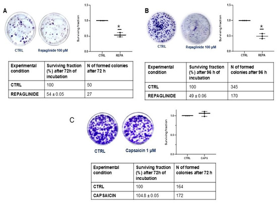 Clone formation with repaglinide and capsaicin in DIPG-36. Effect of 100 µM repaglinide (REPA) on DIPG-36 cell clone formation evaluated after (A) 72 and (B) 96 h of incubation times using the clonogenic assay and the effect of low concentration of (C) capsaicin (CAPS) 1 μM after 72 h of incubation. The data are from at least three samples.* Data significantly different vs controls by Student t test, for p < 0.05.