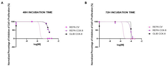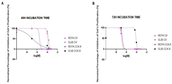 Furthermore, after an incubation time of 72 h we observed a normalized percentage of the inhibition of cell proliferation equal to 0 already using 100 μM REPA with multi-well crystal violet assay; with CCK-8; however, the most effective concentration is 200 μM, obtaining a normalized percentage of inhibition of cell proliferation of 9.32%. GLIB provided time-dependent incubation results with the CCK-8 test, with a normalized percentage of cell proliferation inhibition of 36.95%, using 200 μM GLIB after 48 h of incubation and achieving 0 using the same concentration after an incubation time of 72 h (Figure 3B). No GLIB data was provided in CV assay. GLIB in the CCK-8 assay shows overlapping concentration-response curves with REPA in the CCK-8 assay. The calculated IC50 (M) supports the conclusion (Table 1).