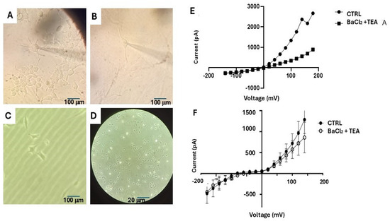 Three different morphological cell types were found in the sampled DIPG-36 populations (number of cells = 60 cells), conventionally defined as multipolar (Figure 4A), bipolar (Figure 4B), and starry (Figure 4C) based on their aspect. Bipolar cells were the most abundant in the sampled population (Figure 4D). Using physiological K+ ion concentrations in the bath and in the pipette solutions, a hyperbolic current–voltage relationship is recorded in whole-cell patches. The resting potential (Vm) of these cells was a −10.2 ± 8 mV characteristic of tumor cells rather than normal neurons. The membrane capacitance was 42.02 ± 12 pF (number of cells = 60), and the mean currents of large intensity were inhibited by BaCl2 (10 mM) and TEA (5 mM) with depolarization (Figure 4E). We also found cells (number of cells = 4) with inward rectifications of the currents at negative membrane potentials and resting potentials close to the equilibrium potentials for K+ ions (Figure 4F) resembling normal neurons.