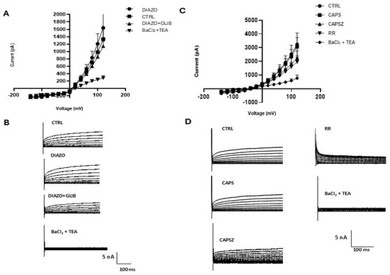 Effects of KATP channel and TRPV1 modulators on cation channel currents in DIPG-36 cells. Left: Effects of KATP modulators on (A) current–voltage relationship and (B) whole cell currents recorded in physiological condition using the patch clamp technique on 10 cells. The KATP opener DIAZO (250 μM) was applied on the external side of the cells, and it was evaluated after DIAZO+GLIB at a 10 μM concentration. Finally, cells were incubated with 10 mM BaCl2 and 5 mM TEA. Right: Effects of TRPV1 modulators on DIPG-36 whole cell currents recorded in physiological condition on seven cells. (C) Current–voltage relationships, and (D) percentage changes in current reduction following the application of TRPV1 modulators. Sample current traces representing the effects of the TRPV1 channel agonist 10μM CAPS that was applied on the external side of the cells, followed by 1 μM CAPSZ, a selective TRPV1 channel blocker; in addition, 10 μM ruthenium red (RR), a non-selective TRP channel blocker, was applied. Finally, cells were incubated with 10 mM BaCl2 and 5 mM TEA to reduce the residual K+ channel currents.