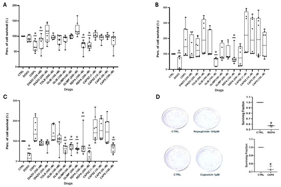Percentage changes in cell survival of DIPG-50 cells in multi-well crystal violet (CV) and clone formation in clonogenic assays. (A) CAPS (50 μM to 100 μM), CAPSZ (1 μM to 10 μM), REPA (100 μM to 200 μM), GLIMP (100 μM to 200 μM), GLIB (100 nM to 100 μM), 500 nM TOLB, DIAZO (250 nM to 250 μM), 10 μM DOXO and 0.1 mM CISP data after 6 h of incubation. (B) CAPS) (50 μM to 100 μM), CAPSZ (1 μM to 10 μM), REPA (100 μM to 200 μM), GLIMP (100 μM to 200 μM), GLIB (100 nM to 100 μM), 500 μM TOLB, DIAZO (250 nM to 250 μM), 10 μM DOXO and 0.1 mM CISP data after 48 h of incubation. (C) CAPS (50 μM to 100 μM), CAPSZ (1 μM to 10 μM), REPA (100 μM to 200 μM), GLIMP (100 μM to 200 μM), GLIB (100 nM to 100 μM), 500 μM TOLB, DIAZO (250 nM to 250 μM), 10 μM DOXO and 0.1 mM CISP data after 72 h of incubation. (D) Effects of 100 µM repaglinide (REPA) and 1 µM capsaicin on DIPG-50 cell clone formation evaluated after 96 h of incubation time using the clonogenic assay in the presence of Matrigel. The data are the mean ± ES of at least three samples and six replicates. Data are significantly different within and between groups with one-way ANOVA test with F values > 2 (*).