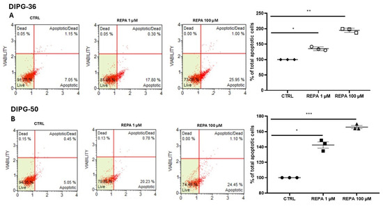 DIPG-36 (A) and DIPG-50 (B) cells were treated with REPA 1 and 100 μM for 48 h, and apoptosis was detected by flow cytometry using the CellEvent™ Caspase-3/7 Green Assay Kit (Thermofisher, C10427). Data are presented as the mean ± standard deviation of three independent repeats, * p < 0.05, ** p < 0.005, *** p < 0.001 vs. controls.