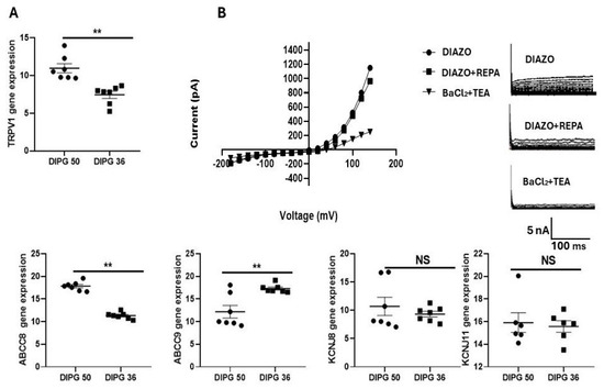 Gene-expression of ion channel genes in DIPG cells in RT-PCR experiments and the response of potassium channel currents to repaglinide (REPA) in whole cell patch clamp in the presence of diazoxide in DIPG-50 cells. (A) Gene expression data are reported as the mean ± SEM of six independent sample experiments. Data was significantly different by Student’s t-test: ** p < 0.05 vs. the other group. (B) Current–voltage relationships and whole cells mean currents recorded in physiological conditions and using patch clamp technique, on DIPG-50 (number of cells = 10). The effect of the KATP antagonist REPA (100 μM) was evaluated in the presence of 250 μM DIAZO, and in the end, cells were incubated with 10 mM BaCl2 and 5 mM TEA. NS, data not significantly different.