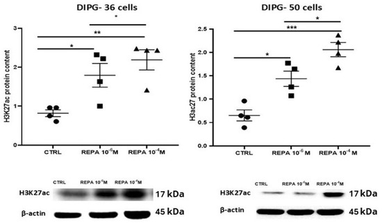 Western blot was performed to evaluate the target proteins content in DIPG-36 and DIPG-50 cell lines; beta-actin was used as the normalization standard in these experiments. In the first Western blot, the H3K27ac protein content, i.e., the acetylation of the lysine at position 27 of histone H3, was evaluated. The H3K27ac protein increased in a concentration-dependent way in both cell lines in the presence of 1 μM and 100 μM REPA (Figure 10).