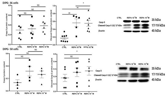 Caspase-3 is an inactive pro-enzyme, which in its inactive form has no role in apoptosis; its active form cleaved-caspase 3 is formed by a proteolytic cleavage during the initiation of apoptosis through various signaling pathways. Thus, this activated enzymatic form plays an important role in apoptosis. In DIPG-36 and DIPG-50 cells, a significantly elevated content of cleaved casp-3 was found in the presence of 1 μM and 100 μM REPA after 48 h of incubation time. The activated casp-3 content agrees with the observed antiproliferative action of REPA in DIPG-36 and DIPG-50 cells (Figure 11).