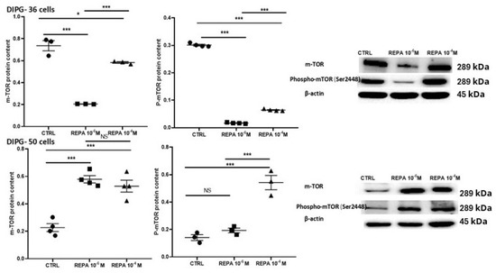 We finally investigated the possible effect of REPA on some intracellular signaling in DIPG as a secondary aim. Dysregulation of mTOR exists in several diseases, including cancer, because its overactivation can promote tumor growth and survival. Phosphorylation of mTOR at Ser2448 is associated with its activation, so its kinase activity increases, leading to the phosphorylation of downstream targets involved in cell growth, proliferation, and metabolism. Dysregulation of mTOR signaling, including phosphorylation of Ser2448, is common in cancer. Hyperactivation of mTOR promotes tumor growth, survival, and metastasis by stimulating cell proliferation, angiogenesis, and resistance to apoptosis. In our experiments, the total mTOR content in DIPG-36 cells decreases after treatment with 1 μM REPA, and a slight decrease is also achieved with treatment with 100 μM REPA. Treatment with 1 μM and 100 μM REPA induces a marked reduction in phospho-mTOR, which may show that this is an additional mechanism of action of REPA, which contributes to the antiproliferative effect (Figure 12). Instead, by treating DIPG-50 cells with 1 μM and 100 μM REPA, the total mTOR and phospho-mTOR are increased. Then, for the DIPG-50 cell line, this cannot be identified as a mechanism of action of REPA antiproliferative effects (Figure 12).