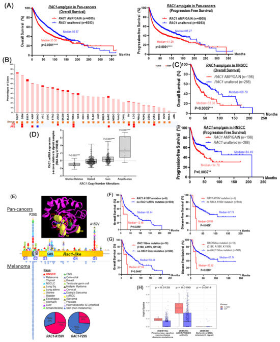 (A) Significantly poorer overall survival (OS; left panel) and progression-free survival (PFS; right panel) of pan-cancer patients with RAC1-amp/gain (n = 4005), versus those with unaltered RAC1 copy number (i.e., diploid, n = 6053) in TCGA Pan-Cancer Atlas. Kaplan–Meier curves are shown with log-rank test p-values. Abbreviations—TGCT: testicular germ cell tumor; GBM: glioblastoma multiforme; ESCA: esophageal carcinoma; KIRP: kidney renal papillary cell carcinoma; COAD: colon adenocarcinoma; ACC: adrenocortical carcinoma; LUSC: lung squamous cell carcinoma; STAD: stomach adenocarcinoma; LUAD: lung adenocarcinoma; SKCM: skin cutaneous melanoma; BLCA: bladder urothelial carcinoma; HNSC: head and neck squamous cell carcinoma; UCS: uterine carcinosarcoma; KICH: kidney chromophobe; KIRC: kidney renal cell carcinoma; DLBC: diffuse large B-cell lymphoma; LIHC: liver hepatocellular carcinoma; BRCA: breast invasive carcinoma; SARC: sarcoma; MESA: mesothelioma; PAAD: pancreatic adenocarcinoma; CHOL: cholangiocarcinoma; OV: ovarian serous cystadenocarcinoma; LGG: lower-grade glioma; PRAD: prostate adenocarcinoma; PCPG: pheochromocytoma and paraganglioma; CESC: cervical squamous cell carcinoma and endocervical adenocarcinoma; UCEC: uterine corpus endometrial carcinoma; THYM: thymoma; UVM: uveal melanoma; THCA: thyroid carcinoma; AML: acute myeloid leukemia. (B) Percent cases with RAC1-amp/gain in 29 out of 31 TCGA pan-cancer types (n = 10967; except for LUSC and UCS) are shown. For each cancer type, % cases with RAC1 gain (moderate increase, per TCGA definition) and amplification (high level increases, per TCGA definition) are indicated in pink and red, respectively. Orange boxes underneath indicated specific cancer types in which RAC1-amp/gain status is significantly associated with increases in aneuploidy score (abbreviated as Aneup.). Red boxes in overall survival (OS) indicate the 6 cancer types in which RAC1-amp/gain are associated with significant poorer OS (GBM, LUAD, HNSC, OV, LGG, and UCEC). Red boxes in progression-free survival (PFS) indicated the 5 cancer types in which RAC1-amp/gain are associated with significant poorer PFS (GBM, KIRP, HNSC, SARC, and LGG). (C) Significantly poorer OS and PFS of HNSCC patients with RAC1-amp/gain (n = 198) versus those with unaltered RAC1 copy number (i.e., diploid, n = 288) in TCGA-HNSCC (Firehose n = 510). Kaplan–Meier curves are shown with log-rank test p-values. (D) Increase in RAC1 mRNA expression in TCGA-HNSCC tumors with increasing RAC1 copy number (TCGA-HNSC, n = 510). (E) Top insert: nearly all HNSCC-associated RAC1 mutations located in close proximity of the GTP-binding site in 3D, where the chemical structure of the substrate, phosphoaminophosphonic acid-guanylate ester, is shown (source: X-ray crystallography structure of Rac1-wildtype protein; PDB: 3TH5). Amino acid residues K116, G15, A159, C18, P29, and N39, which are known to be mutated in TCGA-HNSCC tumors, are highlighted as yellow spheroids. Among these, K116, G15, A159, and C18 represent residues within the G-box (labeled in red), while P29 and N39 represent residues outside the G-box (labeled in yellow). Middle: Mapping of pan-cancer RAC1 mutations on key functional domains of Rac1 protein. Each triangle represents a somatic mutation event identified in patient tumors from pan-cancer sources (curated from combined non-overlapping cases from cBioPortal, COSMIC, and GENIE databases). Mutation mapping of RAC1 from pan-cancer (above) vs. melanoma (below) cases are shown separately. HNSCC-associated RAC1 mutations are indicated as red triangles, and they appear to reside on key functional domains, especially at A159 position of G5-motif. Melanoma-associated RAC1-P29S mutations are indicated as blue triangles, which are mainly located on the switch II region. Bottom: gender distribution of two major RAC1 somatic mutations in pan-cancers. RAC1-A159V-mutated pan-cancer cases are mostly found in females, while RAC1-P29S mutated cases are mostly found in male. (F) RAC1-A159V-mutated HNSCC patients and (G) G-box-mutated (C18X, A159V, and K116X) HNSCC patients have significantly reduced OS and DFS compared to RAC1-wildtype patients in TCGA-HNSCC Firehose cohort (n = 510 patients). Kaplan–Meier curves are shown with log-rank test p-values (* p < 0.05, ** p < 0.01, *** p < 0.001, and **** p <0.0001). (H) Mutational signatures associated with RAC1-A159V-mutated (red) vs. RAC1-WT TCGA-HNSCC tumors (purple). RAC1-A159V HNSCC tumors have significant increases in single base substitutions (SBS) mutational signatures of SBS10b (polymerase epsilon exonuclease domain mutations), SBS13 (AID/APOBEC activity), and SBS20 (defective DNA mismatch repair) vs. RAC1-WT HNSCC tumors (* p < 0.05, ** p < 0.01, *** p < 0.001, and **** p <0.0001).