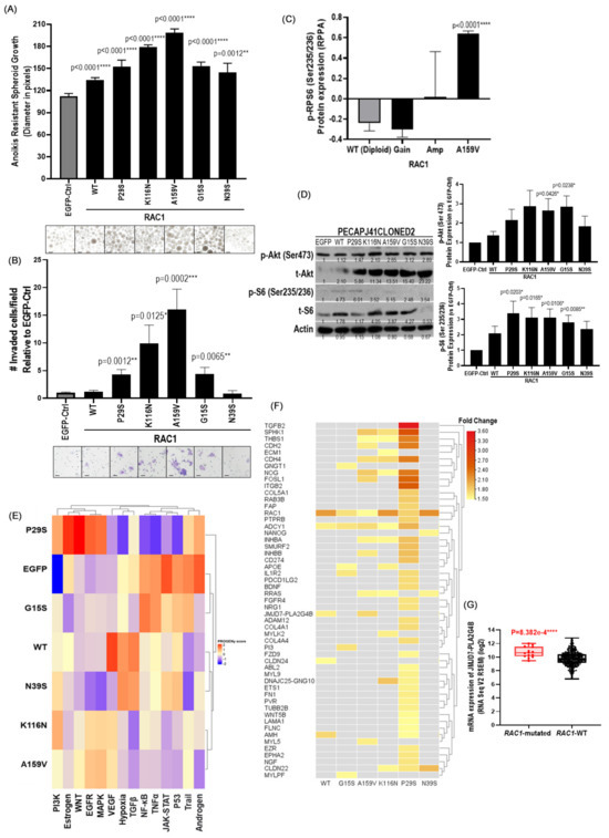 (A) Significant increases in 3D tumoroid growth of PECAPJ41CLONED2 stable cells expressing all RAC1 aberrations (RAC1-WT, RAC1-A159V, RAC1-K116N, RAC1-G15S, RAC1-P29S, and RAC1-N39S) vs. EGFP control (n = 3 wells; 10,000 cells per well; * p < 0.05, ** p < 0.01, *** p < 0.001, and **** p < 0.0001). Cumulative results from >3 independent repeats were shown. Ten bright-field images were taken by CELENA X High Content Imaging System at 96 h after cell plating. A scale bar of 100 µm is shown. (B) Significant increases in invasiveness of PECAPJ41CLONED2 stable cells expressing RAC1-A159V, RAC1-K116N, RAC1-G15S, and RAC1-P29S vs. EGFP-expressing cells (* p < 0.05, ** p < 0.01, *** p < 0.001, and **** p < 0.0001). Graph showing cumulative results from >3 independent experiments in Matrigel® Invasion Chambers with 8.0 μm pores using 5 × 104 engineered cells. Bright-field images (10× magnification) at 24 h of invasion are shown. A scale bar of 100 µm is shown. (C) RAC1-A159V-mutated HNSCC patient tumors have significant increase of phospho-RPS6 (Ser235/236) protein expression compared with RAC1-WT (diploid) tumors in TCGA-HNSCC reverse-phase protein array dataset (n = 209). Normalized quantified values from the reverse phase protein array data are plotted (* p <0.05, ** p < 0.01, *** p < 0.001, and **** p < 0.0001). (D) Validation of PI3K pathway activation by HNSCC-associated RAC1 aberrations by Western blotting in PECAPJ41CLONED2 stable cells expressing EGFP, RAC1-WT, RAC1-A159V, RAC1-K116N, RAC1-G15S, RAC1-P29S, and RAC1-N39S. Graphs showing cumulative results from >4 independent experiments with quantified fold changes of p-AKT(S473) and p-S6 (S235/236) levels vs. EGFP control (* p < 0.05, ** p < 0.01, *** p < 0.001, and **** p < 0.0001). The uncropped blots are shown in Supplementary File S1. (E) Pathway RespOnsive GENes for activity inference (PROGENy) analysis showing universal PI3K activation in PECAPJ41CLONED2 stable cells expressing all HNSCC-associated RAC1 aberrations vs. EGFP-control cells. Heatmap visualization of z-coefficients matrix for all features in the 14 cancer signaling pathways using ComplexHeatmap (R package, version 2.15.3). Activity score values ranging from −2 to 2 are displayed. (F) Heatmap showing significant up-regulation of metastasis-related genes by various RAC1 mutations [fold change > 1.5 (TPM + 1) vs. PECAPJ41CLONED2-EGFP-expressing cells] based on our in-house curated HNSCC-metastasis-related gene list with 1283 genes [25]. (G) Significant increase in JMJD7-PLA2G4B mRNA expression was observed in RAC1-mutated HNSCC tumors vs. RAC1-WT tumors in TCGA-HNSCC cohort (n = 510; * p < 0.05, ** p < 0.01, *** p < 0.001, and **** p < 0.0001).