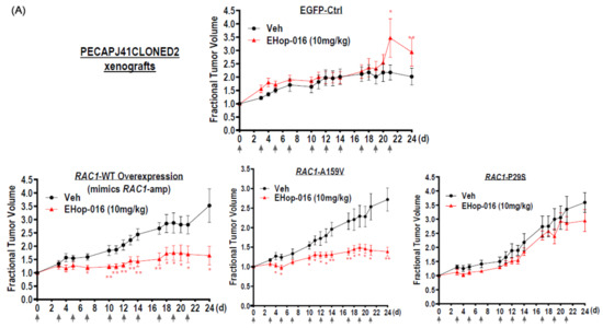 3.12. RAC1-A159V and RAC1-Amp Xenografts Sensitive to EHop-016 Sensitivity In Vivo
