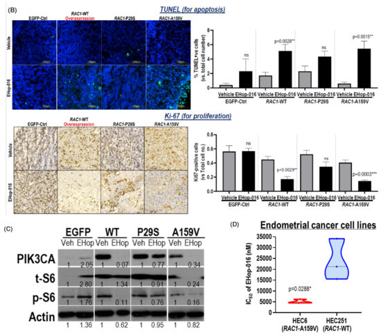 (A) HNSCC PECAPJ41CLONED2 xenograft models overexpressing RAC1-WT (mimicking RAC1 amplification) and RAC1-A159V were highly sensitive to EHop-016 in vivo, while EGFP-control and RAC1-P29S xenografts were not responsive to EHop-016 treatment. Fractional tumor growth of mice treated with vehicle or EHop-016 (10 mg/kg, 3 times a week, i.p.) are shown as mean with SEM (n = 8 per group). (B) EHop-016 resulted in marked reduction of cell proliferation in RAC1-WT (mimicking RAC1 amplification) and RAC1-A159V tumors (but not in RAC1-P29S tumors), as indicated by reduced Ki-67 staining, and with significant induction of apoptosis (as indicated by TUNEL-positive cell percentage). A scale bar of 100 µm is shown. (C) Specific downregulation of PI3K signaling by EHop-016 (vs. vehicle control) in HNSCC xenografts overexpressing RAC1-A159V and RAC1-WT (mimicking RAC1 amplification), as indicated by reduction in PIK3CA, p-S6 (Ser235/236) and S6 protein expression. Experiments were repeated 3 times independently with similar results. The uncropped blots are shown in Supplementary File S1. (D) Endometrial cancer cells, HEC6 (endogenous RAC1-A159V mutation; www.cbioportal.org), but not HEC251 (RAC1-WT diploid), displayed preferential sensitivity to EHop-016, as indicated by significantly lower IC50 of EHop-016 in HEC6 than in HEC251 (assayed by MTT at 72 h of treatment). Cumulative violin plots of IC50 of 3 independent experiments. p-value calculated by t-test. Asterisks indicated levels of statistical significance in all sub-panels above: * p < 0.05, ** p < 0.01, and *** p < 0.001.