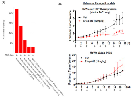 (A) Copy number alteration frequency of RAC1 in metastatic melanoma in MSK, UCLA, and TCGA PanCancer Atlas cohorts. Source: www.cbioportal.org (data accessed on 10 May 2024). (B) Melanoma xenografts, MeWo-overexpressing RAC1-WT (mimicking RAC1-amplification), were sensitive to EHop-016 treatment (vs. vehicle control), while MeWo-RAC1-WT xenografts were not (upper panel). Fractional tumor growth of xenografts during treatment was shown (mean with SEM; n = 4 per group). In vivo EHop-016 sensitivity in MeWo-RAC1-WT xenografts was accompanied by significant induction of apoptosis (TUNEL), while no significant change in apoptosis was observed in MeWo-overexpressing RAC1-P29 (lower panel). (C) EHop-016 resulted in marked induction of apoptosis in RAC1-WT-amp MeWo xenografts when compared to vehicle treatment (p = 0.0005; by TUNEL assay, red dots indicated apoptotic cells), but not in RAC1-P29S MeWo xenografts (p = n.s.). Asterisks indicated levels of statistical significance in all sub-panels above: ** p < 0.01, and *** p <0.001.