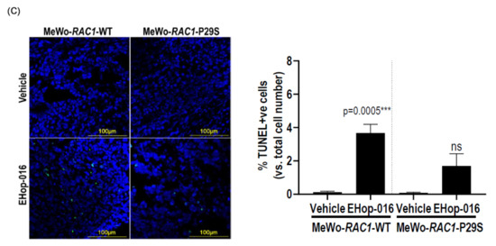 Until now, preclinical Rac inhibitors all demonstrated limited activities in RAC1-driven melanoma models in vivo [16,44]. Also, no study has been conducted with EHop-016 treatment in melanoma models in vivo. Given our observation that RAC1-amplified HNSCC were pharmacologically vulnerable to EHop-016, we tested the hypothesis that RAC1-amp status in other cancer, such as melanoma, might also confer sensitivity to Rac1 targeting using EHop-016. As shown in Figure 5B,C, we found that MeWo-xenografts overexpressing the RAC1-WT gene (mimicking RAC1 amplification) displayed sensitivity to EHop-016 targeting with significant tumor reduction, and apoptosis induction when compared to vehicle treatment (p = 0.0005 ***, n = 4), whereas MeWo-RAC1-P29S xenografts were basically insensitive to EHop-016 treatment (p = n.s., n = 4), which was consistent with our findings in HNSCC P29S-xenograft models. There was no significant change in body weights of mice upon EHop-16 treatment (Figure S5A). Therefore, in addition to HNSCC, RAC1 amplification in melanoma (representing 6–22% cases of metastatic melanoma) may also be targetable, in principle, by Rac inhibitors.