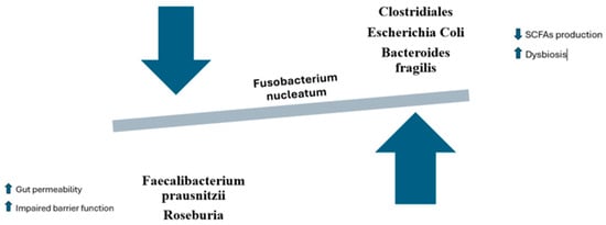 The role of Fusobacterium nucleatum in intestinal dysbiosis and colon carcinogenesis is a complex phenomenon, involving molecular mechanisms that modulate gut microbial composition, inflammation, and metabolite production []. F. nucleatum has been linked to reduced bacterial diversity, disrupting the balance between beneficial bacteria, such as Lactobacillus and Bifidobacterium, and harmful or pro-inflammatory bacteria like Bacteroides fragilis and Enterococcus (Figure 2) [,]. In dysbiotic conditions, F. nucleatum disrupts the activity of beneficial microbes responsible for generating short-chain fatty acids (SCFAs), including acetate, propionate, and butyrate, which are critical for maintaining gut health [,,]. Butyrate, in particular, is essential for gut barrier integrity and energy supply to colonocytes. Its reduction, due to the suppression of key butyrate-producing bacteria like Faecalibacterium prausnitzii and Roseburia, leads to a weakened intestinal epithelium and increased gut permeability [,]. This impaired barrier function facilitates inflammation and further microbial imbalance. F. nucleatum also promotes the growth of other harmful microbes, such as pathogenic strains of Clostridia and Escherichia coli, which are less efficient in producing SCFAs and exacerbate dysbiosis [,,,]. As a result, SCFA production decreases, contributing to gut dysfunction and compromised immune regulation.
