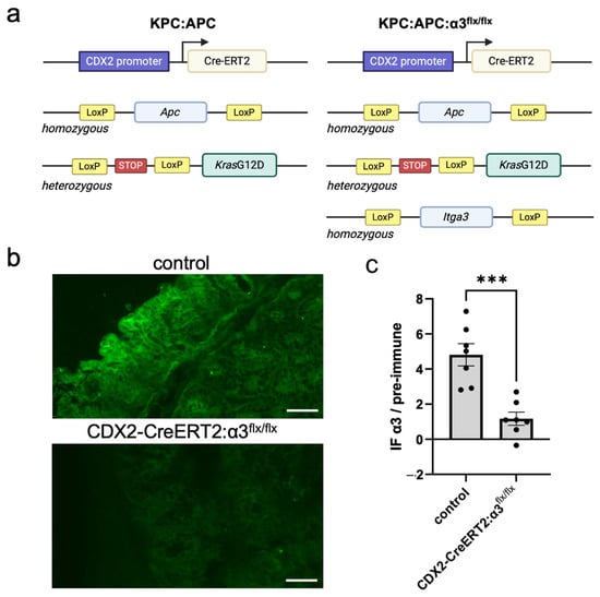 We first sought to determine the effect of ablating α3β1 on the early stages of CRC development in vivo. For these experiments, we utilized the established genetically engineered KPC:APC model in which conditional mutant alleles predispose mice to the development of colonic tumors following treatment with tamoxifen [13]. As illustrated in Figure 1a, KPC:APC mice are homozygous for a floxed Apc allele and heterozygous for an oncogenic G12D point mutation engineered into the endogenous Kras gene, such that its expression is blocked by a loxP-flanked stop codon. These mice also carry a CDX2-Cre-ERT2 transgene that directs the expression of a tamoxifen-inducible Cre-ERT2 fusion protein to the epithelium of the distal ileum and throughout the colon from the crypt base to the luminal surface [13]. As described previously, tamoxifen-induced activation of Cre-ERT2 leads to the simultaneous activation of the KrasG12D oncogene and loss of the floxed Apc tumor-suppressor gene, constituting a “molecular switch” that drives the development of colonic dysplasia and cancer development that is genetically and histologically similar to KRAS-mutated colorectal cancer in humans [13]. We crossed a floxed Itga3 allele [41] into the KPC:APC model to generate KPC:APC:α3flx/flx mice, in which tamoxifen treatment (see Section 2) causes the Cre-mediated deletion of α3 simultaneously with the activation of the cancer-causing genetic lesions (Figure 1a). A loss of α3 from the colon of CDX2-CreERT2:α3flx/flx mice following an IP injection of tamoxifen (see Section 2) was confirmed by the IF staining of cryosections with an antiserum specific for α3, which was reduced compared with tamoxifen-treated mice that lack the CDX2-CreERT2 transgene (Figure 1b). Quantification of IF intensity in colon sections collected 9 days after initial tamoxifen treatment showed that anti-α3 staining in CDX2-CreERT2:α3flx/flx mice was reduced to the near-background levels seen in staining with the corresponding pre-immune serum (Figure 1c). Importantly, reduced α3 staining indicates a loss of integrin α3β1, since the α3 subunit pairs exclusively with the β1 subunit [15,19].