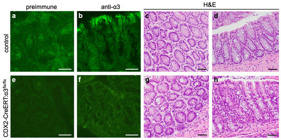 First, we determined whether Itga3 deletion altered normal colon histology during our experimental timeframe. These experiments utilized CDX2-CreERT2:α3flx/flx mice generated through the above-described intercross (Figure 1a) that did not carry the KrasG12D oncogene and were Apc+/+ (i.e., these mice were not susceptible to colorectal dysplasia or cancer following tamoxifen treatment). We treated CDX2-CreERT2:α3flx/flx mice or control mice (i.e., CDX2-CreERT2:α3+/+) with tamoxifen, then isolated colon tissue 7–11 days later for histological comparison (Figure 2; 9 days pictured). IF staining of cryosections confirmed reduced α3 expression in colon from CDX2-CreERT2:α3flx/flx mice (Figure 2e,f), compared with control mice (Figure 2a,b). H&E staining of paraffin sections revealed normal tissue structure in colons from both control mice (Figure 2c,d) and CreERT2:α3flx/flx mice (Figure 2g,h), with parallel crypts lined with epithelial cells, including goblet cells, showing that the ablation of α3β1 did not alter the tissue structure of normal adult colons.