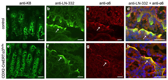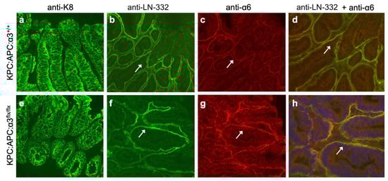 IF revealed a similar distribution of LN-332 in colon cryosections of control mice (Figure 3a,b) or CDX2-CreERT2:α3flx/flx mice (Figure 3e,f), where it localized to the basement membrane at the upper portion of the crypt, as reported previously [46]. LN-332 is a ligand for integrins α3β1 and α6β4, which are co-expressed in many epithelial tissues and carcinomas [25], including the colon epithelium and CRC [30,46]. Interestingly, the colocalization of α6 integrin with LN-332 was enhanced in the colons of tamoxifen-treated CDX2-CreERT2:α3flx/flx mice (Figure 3f–h), compared with control mice (Figure 3b–d), possibly reflecting compensatory adhesion mediated by α6β4 when α3β1 is absent. Indeed, previous studies have shown that α6β4-mediated adhesion to LN-332 persists in the epidermis or cultured keratinocytes following the genetic ablation of α3β1, indicating a capacity for functional compensation between these two integrins [47,48].