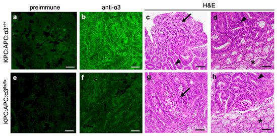 Genetic deletion of Itga3 in the colon of KPC:APC mice does not alter colonic dysplasia. Colon tissue was isolated from tamoxifen-treated KPC:APC:α3+/+ mice (a–d) (n = 10), or KPC:APC:α3flx/flx mice (e–h) (n = 8). Cryosections were stained with pre-immune serum (a,e) or anti-α3 (b,f) to confirm α3 deletion. Paraffin sections were stained with H&E; examples of proximal colon (c,g) and distal colon (d,h) are shown for each genotype. Arrows, examples of high-grade dysplasia; arrowheads, examples of low-grade dysplasia; asterisks, areas of normal colon. Scale bars, 50 μm.